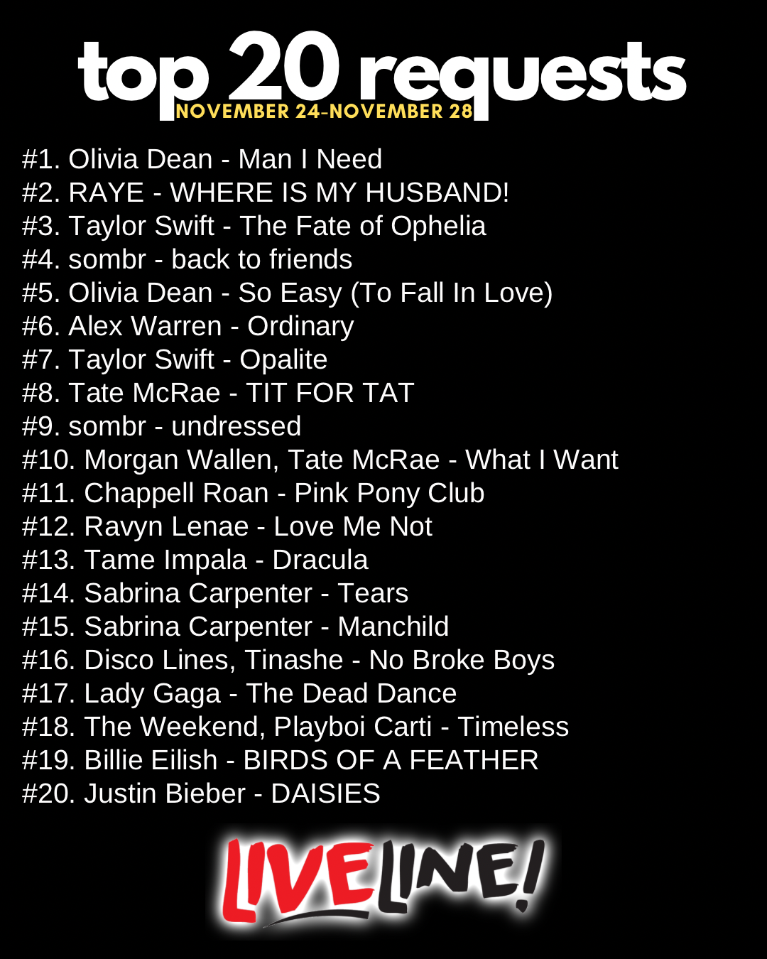Call or text 85-LIVELINE with your shoutouts and requests, and follow @LivelineRadio for all the latest.