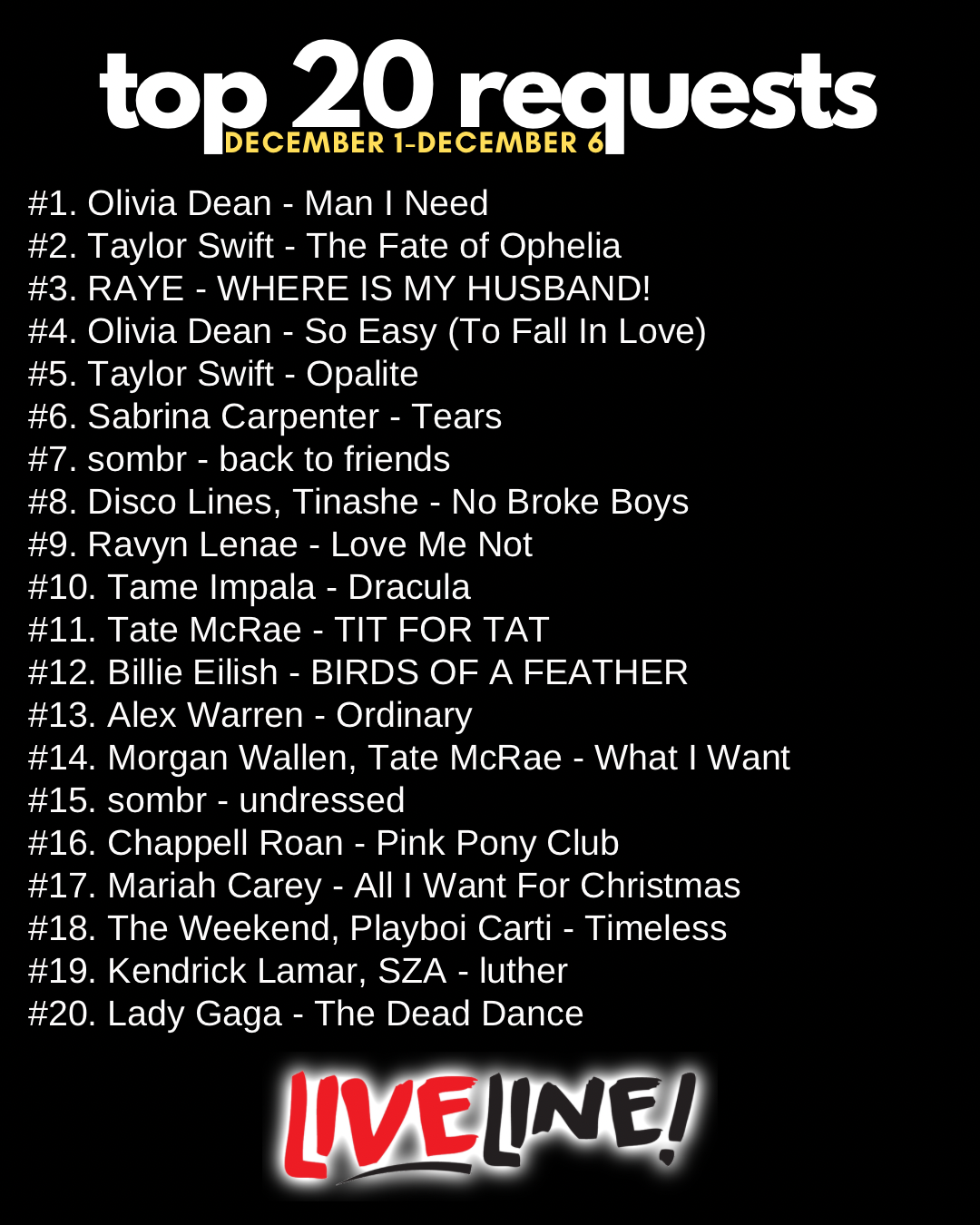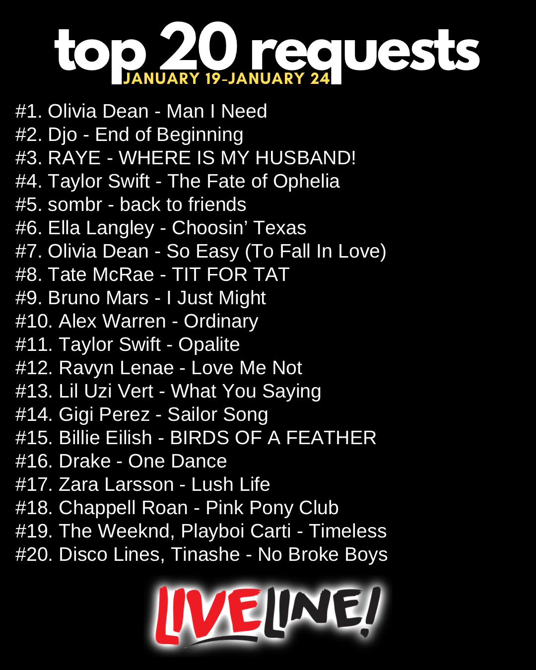 Call or text 85-LIVELINE with your shoutouts and requests, and follow @LivelineRadio for all the latest.